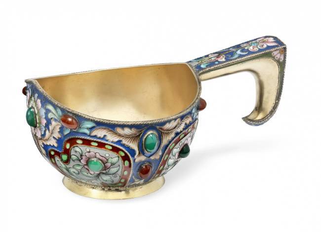 Russian silver Kovch, richly decorated with an artistic pattern made using cloisonne enamel technique. The unique Salmon enamel applied in the form of stylized pink flowers and also gently green foliage on gray background in red cartouches are especially notable. Red and green cabochons are encrusted in the drawing around the bucket. Gilding.