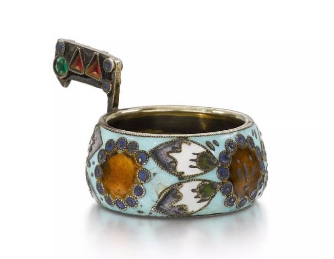 Miniature silver Fabergé kovsh with cloisonné and stained glass enamel. Fyodor Rückert, Moscow, 1908–1917