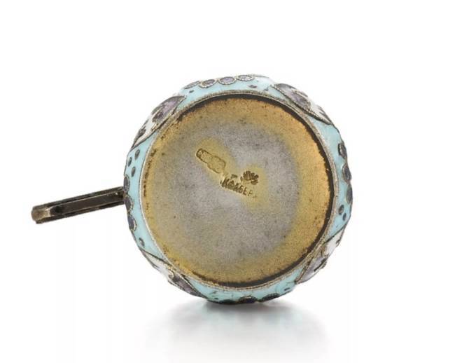 This elegant kovsh, created in the workshop of Fyodor Rückert for the House of Fabergé, is a magnificent example of Russian decorative and applied art of the Art Nouveau era. The round bowl is decorated with polychrome cloisonné enamel with blue stylized flowers and white leaves, executed in the Pan-Slavic style, on a sky-blue background. An elegant pen decorated with geometric motifs in the form of triangles and circles, made using the technique of stained glass and cloisonné enamel, completes the exquisite composition, emphasizing the aesthetics of Russian Art Nouveau. Hallmarks: poorly legible mark of the Moscow Assay Office of 1908-1917, the numbers 88, poorly legible letters FR in Latin, partially covered by the inscription K. Fabergé under the double-headed eagle, confirming the status of the official supplier of the imperial court. Dimensions: length 3.4 cm, width 2.3 cm, height 2.7 cm, Weight: 10.12 grams.