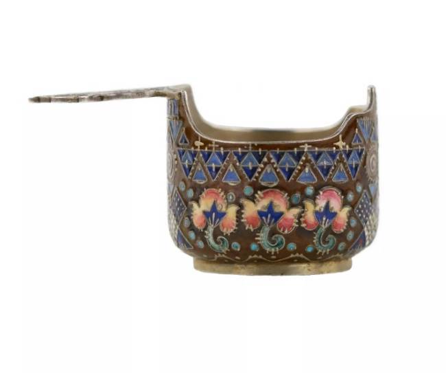 Russian Art Nouveau kovsh in cloisonné enamel by Fyodor Rückert. Moscow, 1908-1917