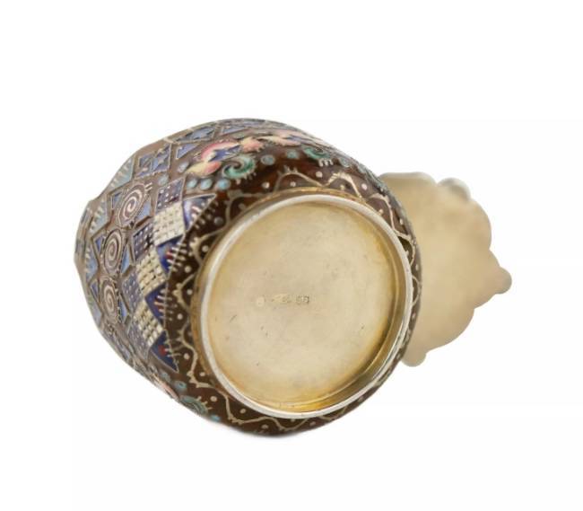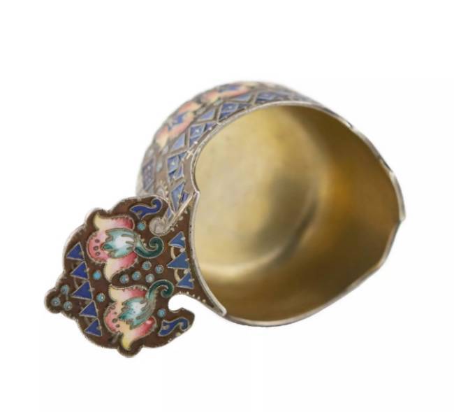 It is a cylindrical bowl with a contoured edge and a transverse heart-shaped handle. The body and top side of the handle are decorated with painted, fairy-tale flowers and geometric motifs of blue triangles on the deep, signature brown background of Feodor Rückert. The stem and sternpost are marked with a geometric motif of spirals, rhombuses and triangles, stylizing jets of water, flowers or solar signs. High pictorial generalization is introduced by applied drops of icicles, crosses and lattices made of pure silver. They give the work endless depth and nostalgia of the Russian north. On the base of the ladle there are Moscow hallmarks of 88 standard silver of 1908-1917 and the initials of the leading Fabergé enameller Fyodor Rückert, FR in a square shield. Height 4.5 cm. Diameter: 5 cm. Weight: 83 g.