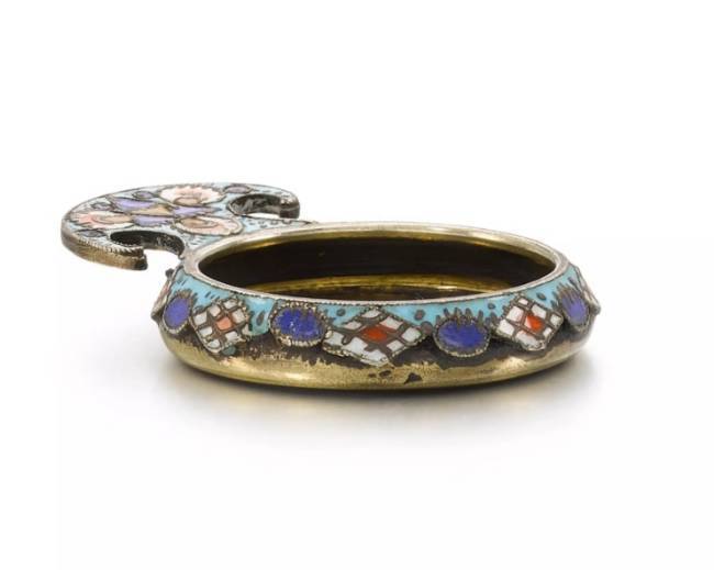 Miniature silver kovsh by Faberge with gilding and cloisonné enamel. Fyodor Rückert, Moscow, 1908-1917