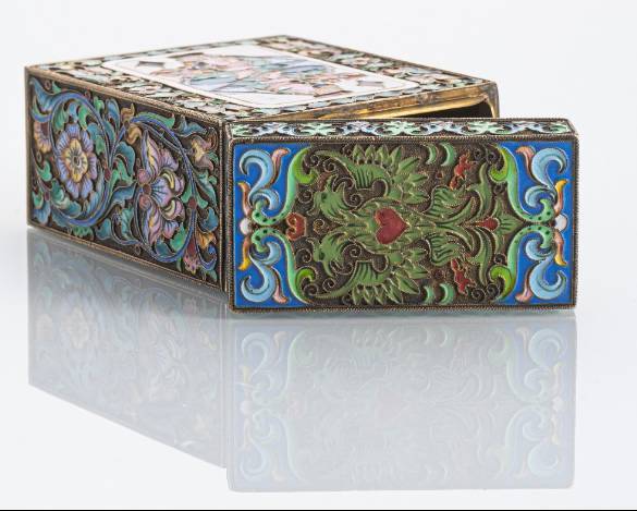 Argent, partiellement doré, décor en émail cloisonné polychrome avec motifs de cartes à jouer, fleurs et aigle bicéphale. Marque Kokoshnik avec delta et 88 (Zolotnik), marque de maître "FR" (cyrillique) pour Fedor Rückert (atelier), ainsi que marque de fournisseur de la cour de Fabergé. Environ 410 g. Min. usé.