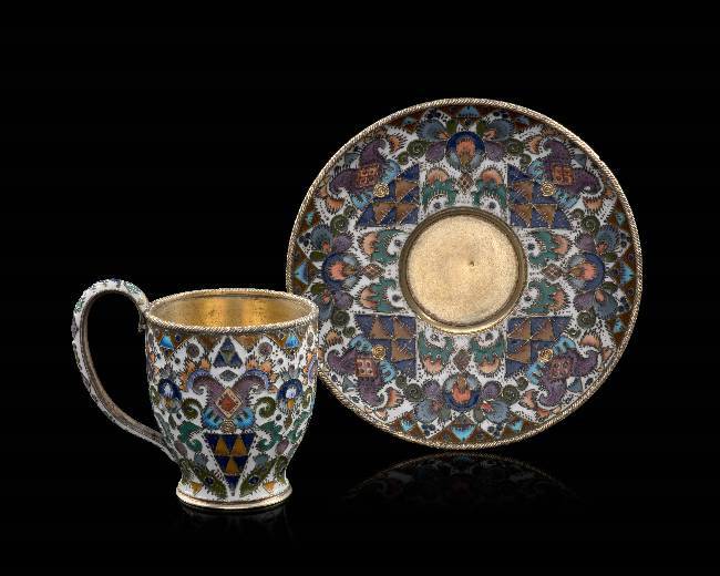 A silver-gilt and polychrome cloisonne enamel cup and its saucer, by Fabergé, Ruckert, Moscow, 1908-1917