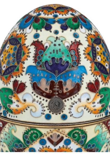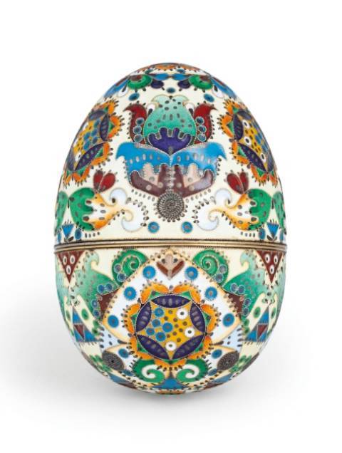 A SILVER-GILT AND CLOISONNÉ ENAMEL EGG, 20TH CENTURY, SPURIOUS MARKS OF MOSCOW, 1896-1908, F. RUCKERT; DEFECTS