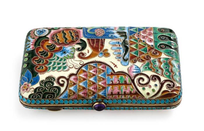 A SILVER-GILT AND CLOISONNÉ ENAMEL CIGARETTE CASE, 20TH CENTURY WITH SPURIOUS MARKS OF MOSCOW, 1896-1908, MARKS OF F. RUCKERT; WEAR