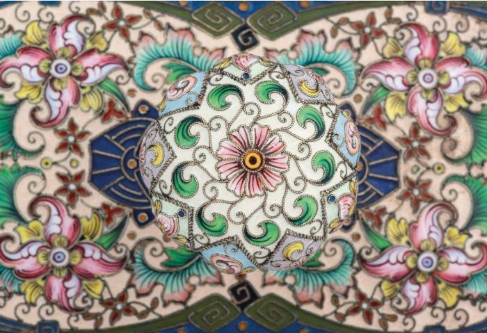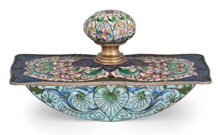 A RUSSIAN SILVER, CLOISONNÉ ENAMEL AND WOOD INK BLOTTER,