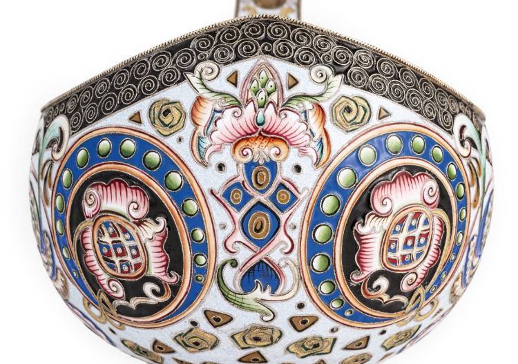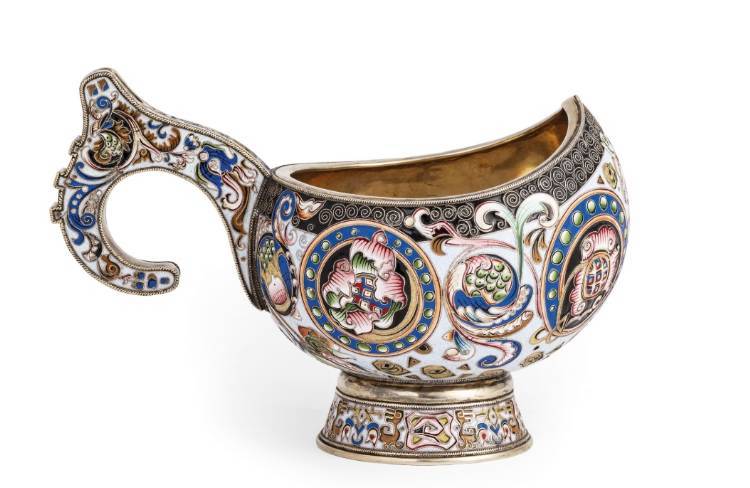 A RUSSIAN PRESENTATION SILVER-GILT AND CLOISONNÉ ENAMEL KOVSH, MOSCOW, 1908-1917,