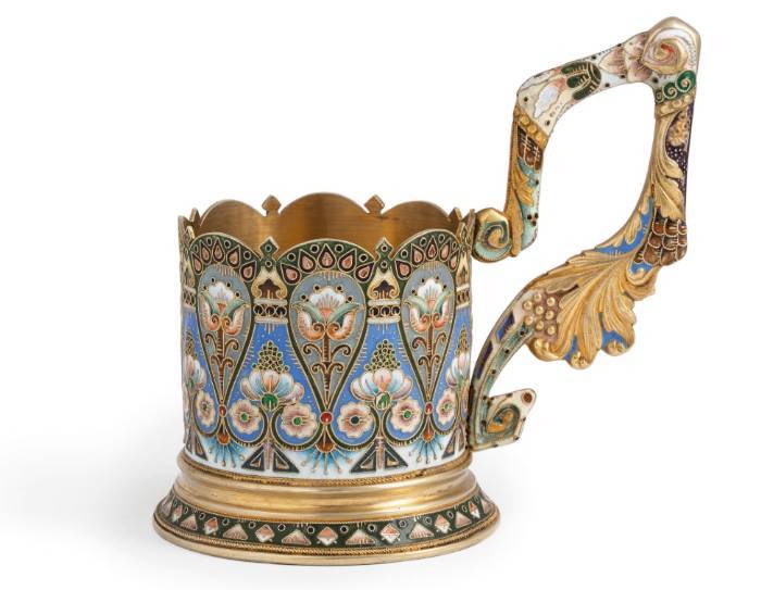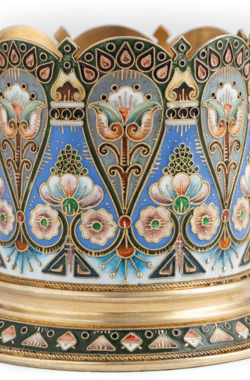 A RUSSIAN SILVER-GILT AND CLOISONNÉ ENAMEL TEA CUP HOLDER, MOSCOW, 1908-1917