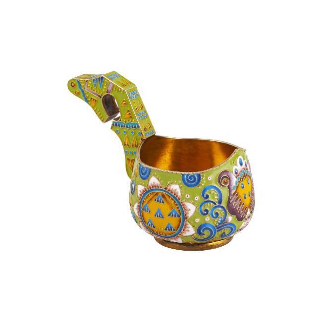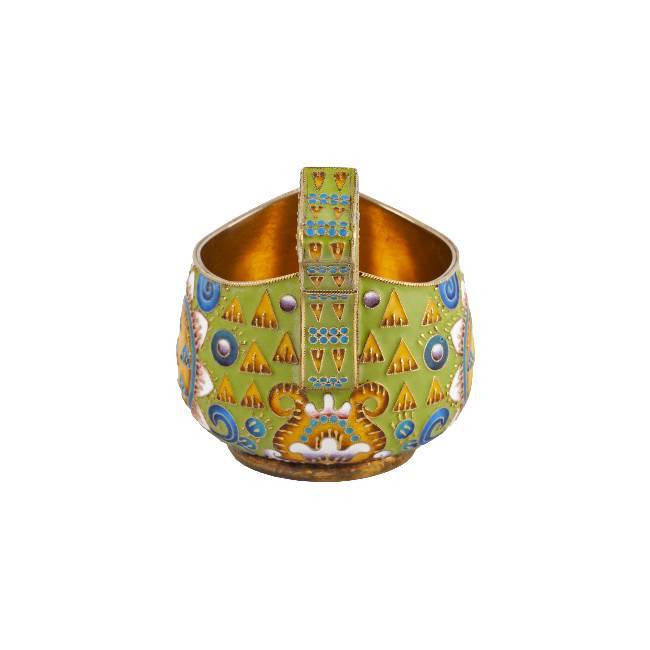 A very fine Faberge silver-gilt and cloisonne enamel kovsh. Makers mark of Fedor Ruckert for Faberge firm. Moscow, 1908-1917. Dimensions: 8 x 11 x 7 cm.