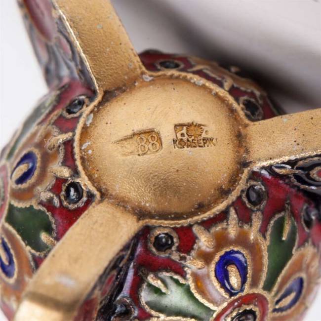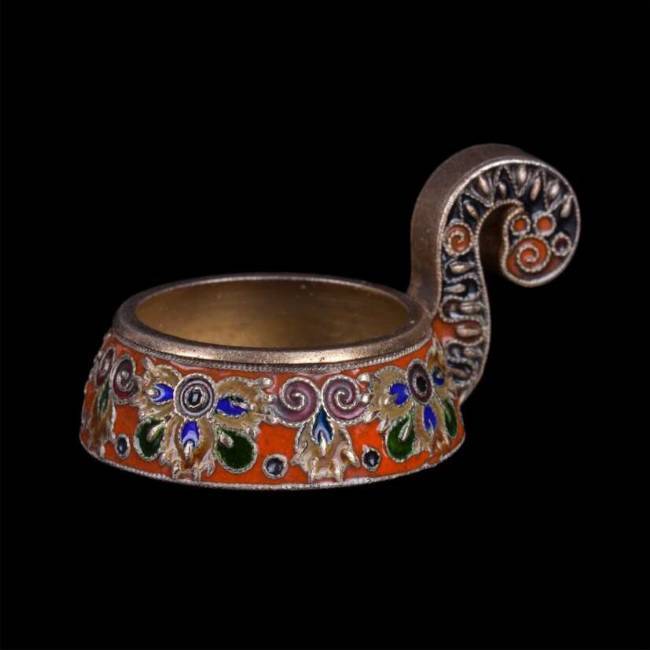 Серебро 88-й пробы, скань, перегородчатая эмаль. Москва, после 1908 года, мастер Фёдор Рюкерт, фирма К.Фаберже. Высота ковша: 23 мм.