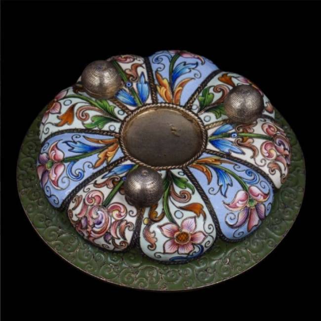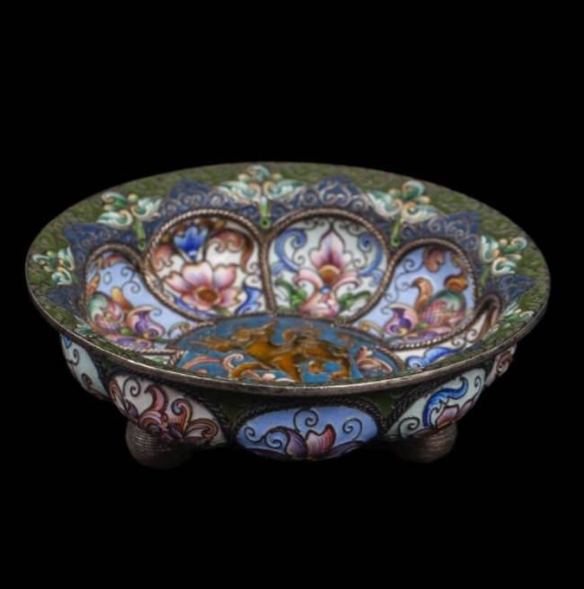 Декоративная ваза на ножках шарах в неорусском стиле. Серебро, расписная эмаль, позолота. Мастерская Ф. Рюккерта (?). Москва, 1898-1908.