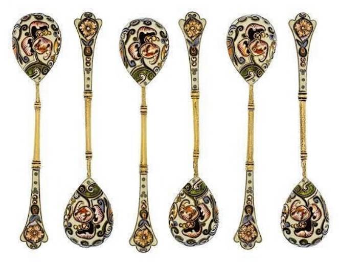 A Set of Six Russian Silver-Gilt and Enamel Demitasse Spoons, Mark of K. Faberge with Imperial warrant, overstriking mark of FR