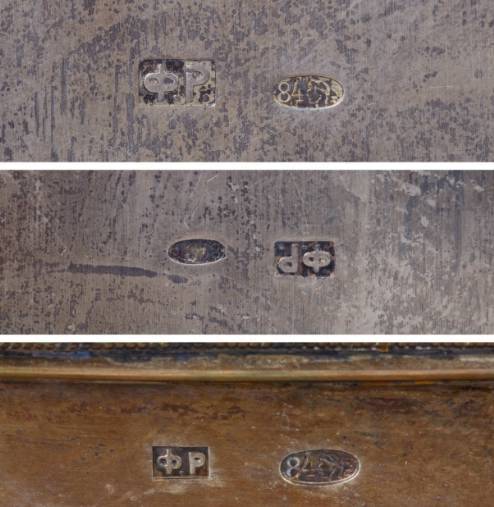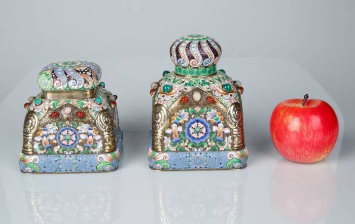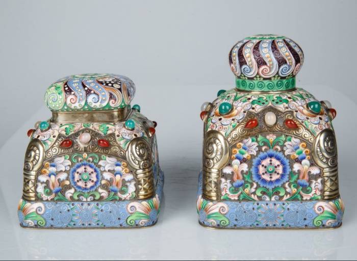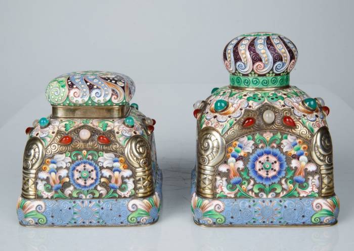 a pair of 20th century tea caddies, the body is decorated with Slavic foliate and floral motif and garments on guilded ground, with images of sirens on two sides, both pieces have spurious mastermarks F.R. for Feodor Ruckert in Cyrillic, with 84 standart mark on the bottom; height: 16 and 13 cm (6 1/4 and 5 1/8 in.)
