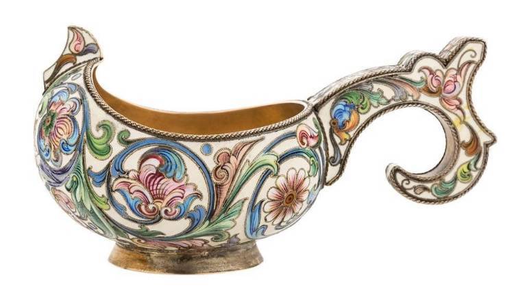 A FABERGE SILVER-GILT, FILIGREE AND SHADED ENAMEL KOVSH, WORKMASTER FEODOR RUCKERT , MOSCOW, 1898-1908