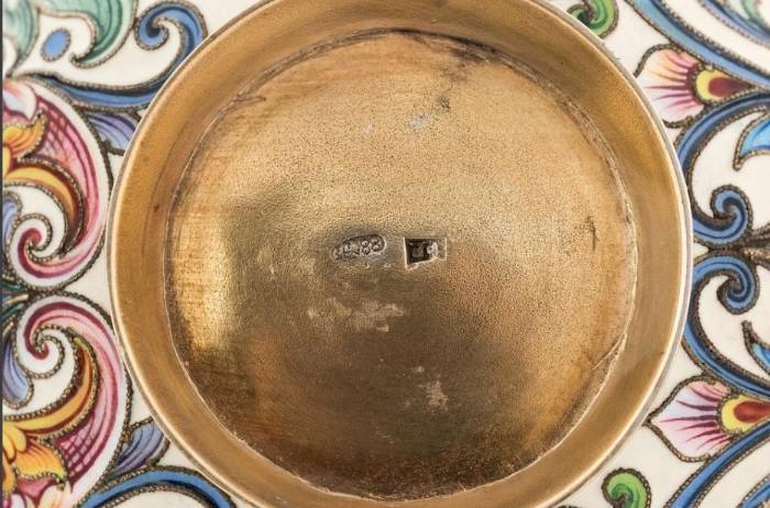 the surface enamelled in polychrome shaded scrolling flowers on a cream ground, with ring foot and hook handle, 88 standard, workmaster`s mark F.R. for Feodor Ruckert, Moscow, 1898-1908, height: 4.5 cm. (1 3/4 in.)