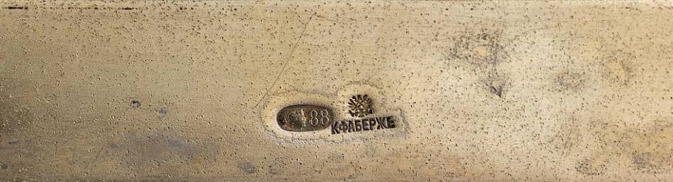 depicting Saint Nino holding a cross, her other hand the Bible, egg tempera and gesso on wood panel, overlaid with oklad, applied overall with stylized flowerheads and foliage against a shaded moss green ground, the halo with conforming decoration against a deep blue ground, marked with 88 standard and Faberge mark with Imperial warrant; dimensions of icon: 10.5 x 7.8 cm (4 1/8 x 3 1/8 in.)