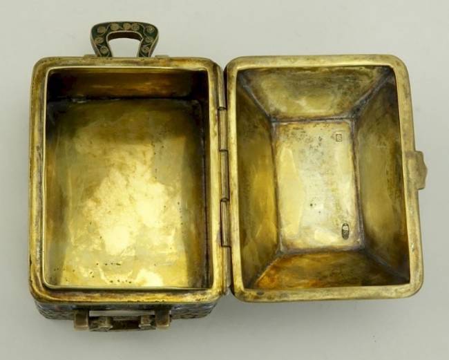 20th Century Russian Cloisonne Enamel Hinged Box. Signed Faberge, Double eagle Imperial Warrant Mark, FR and 88 Kokoshnik. Good condition. Measures 1-7/8" H, 2-3/4" L. Approx. weight: 5.5 Troy ounces.