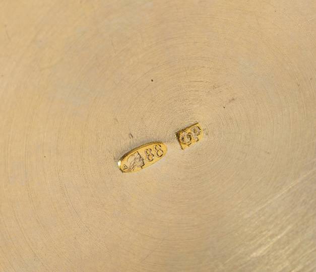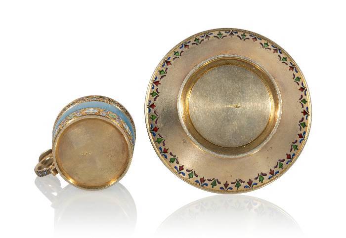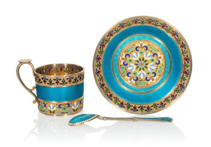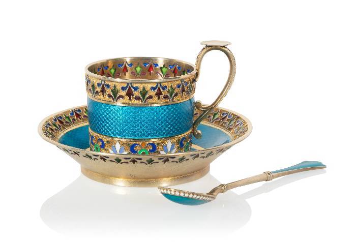 A Russian Gilt Silver Cloisonné, Plique à Jour, and Guilloché Enameled Demitasse Cup, Saucer, and Spoon