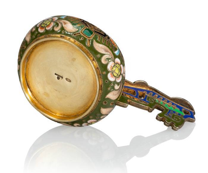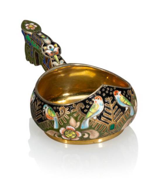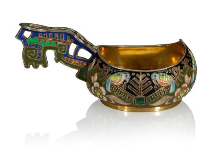 A Russian Pan-Slavic Cloisonné Enameled Gilt Silver Kovsh
