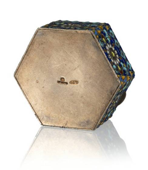 A Russian En Plein and Cloisonné Enameled Gilt Silver Pill Box: Falconer