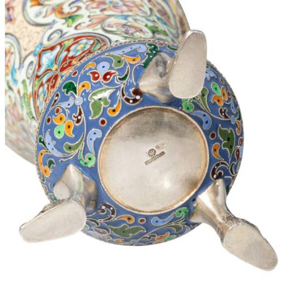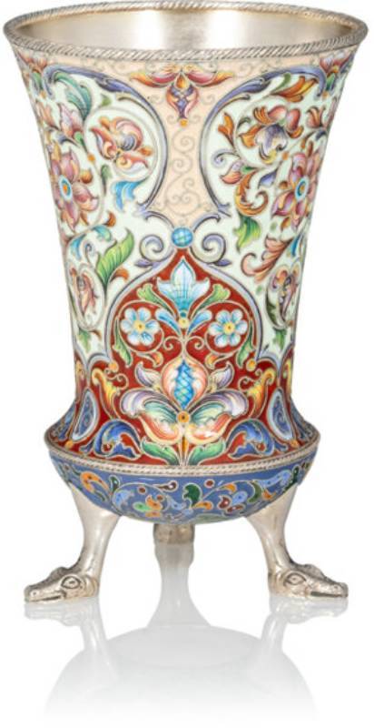 A Russian Cloisonné Enameled Three-Footed Gilt Silver Beaker
