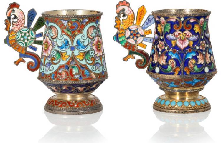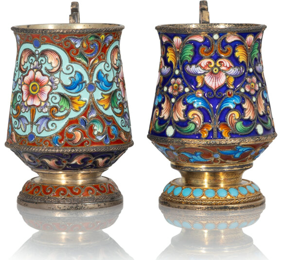 A Pair of Russian Cloisonné Enameled Gilt Silver Cups
