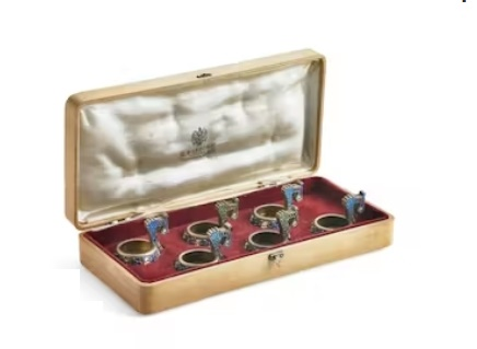 About the is, of Pan-Slavic style, round inward bodies with multicoloured translucent and opaque enamelled circles, edgy handles. Carl Fabergé, workmaster Feodor Rückert, Moscow 1908–1917, 88 standard. H. 1.6 cm. Weight c. 104 g. In original wooden box, marked K. Fabergé - Moscow, St. Petersburg, Odessa in Cyrillic, below the Imperial Warrant. (7).