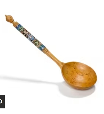 Russain karelian birch, silver and shadowed cloisonné enamel serving spoon. Workmaster Feodor Rückert. C. 1900. L. 19.5 cm.