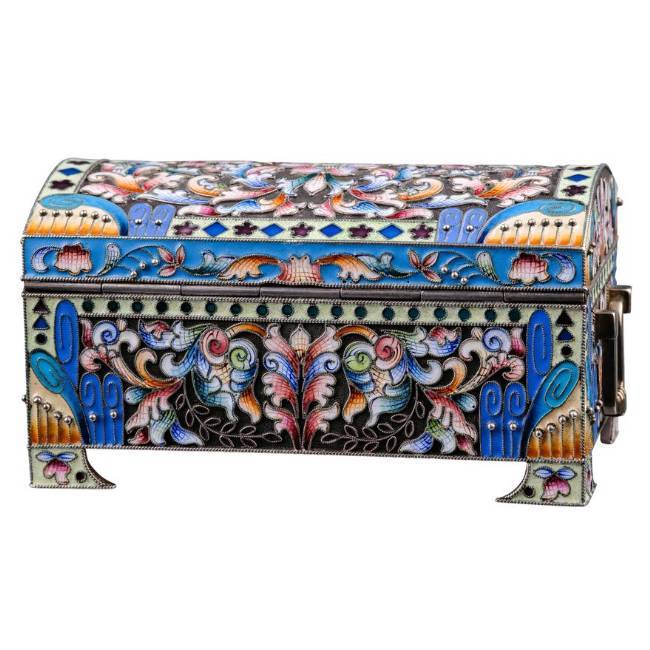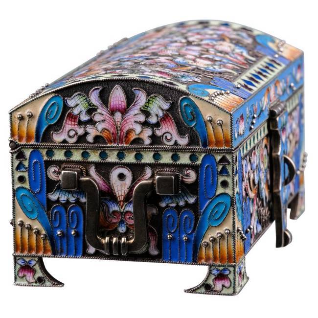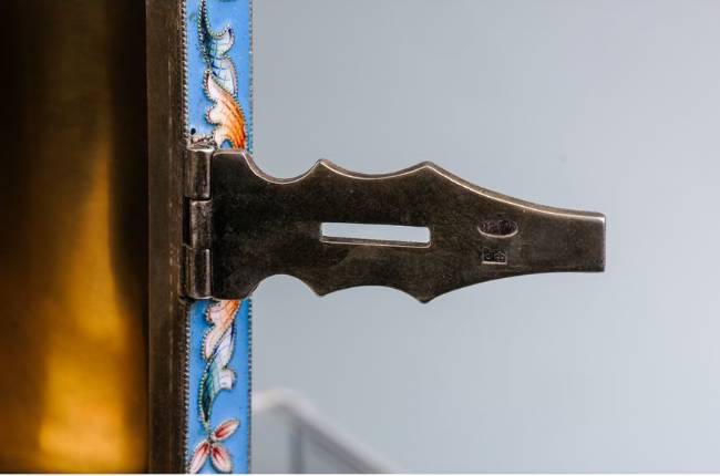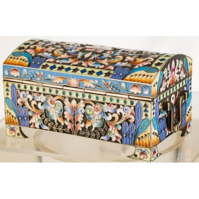 Objektbeschrieb: Moskau, 1908-1917. Meistermarke Fedor Rückert. Silber. Feingehalt 916. Wandung mit reichem Cloisonné-Dekor. Inseitig vergoldet.