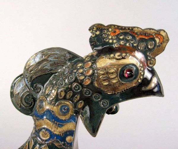 Having a firebird handle with red glass eyes, the whole decorated with floral and geometric motifs in shaded enamels, stamped 88 standard and bearing Fabergé marks in Cyrillic.