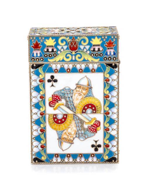 A Russian Silver-Gilt and Enamel Card Box Spurious marks of Fedor Ruckert, Moscow, early 20th century the box decorated with polychrome foliate and geometric decoration throughout, the sides with enamel plaques depicting the King of Clubs. marked on underside 6 ozt 19 dwt gross Height 4 x width 2 5/8 x depth 1 1/2 inches.