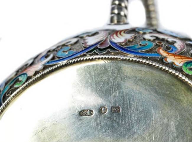 Hallmarked on underside: 88 zolotnik with Moscow city mark from 1908–1926, unidentified master's mark, and hallmark in the form of a head.