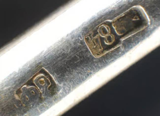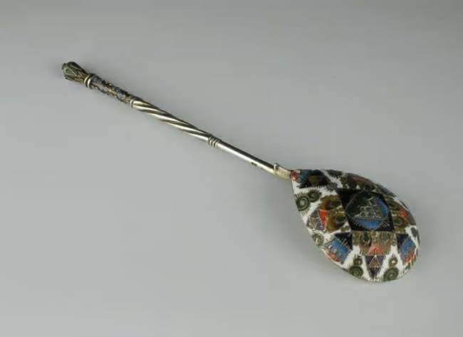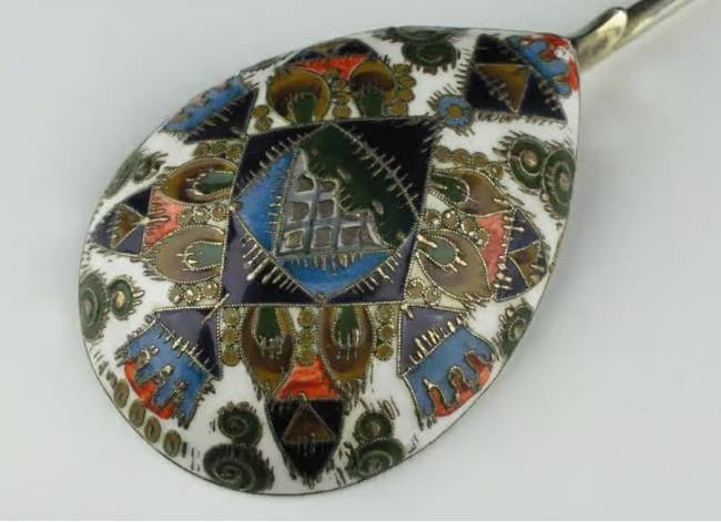 Deep bowl, long stem, spirally twisted in the middle. Cloisonné decoration in light blue, dark blue, iron red, manganese, ochre, and green on a white ground on the underside of the bowl and at the end of the handle. Marked "Werkmeister Theodor Rückert". 84 silver mark. (690201)