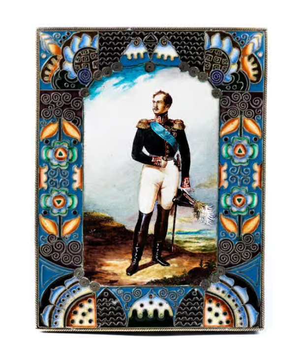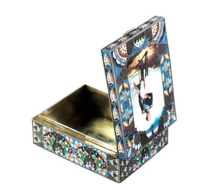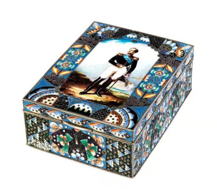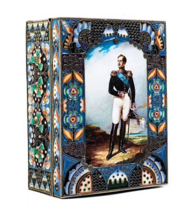 Silber, geschnitten, godronniert, emailliert. Kastenförmiger Korpus mit Stülpscharnierdeckel und feinem ornamentalem Cloissonné-Dekor. Deckel mit feiner Miniaturmalerei Zar Nikolaus I darstellend. (10813729) (2) (13)