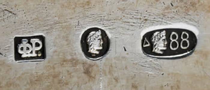 Bodenseitige Punzen: 88 Zolotnik mit Moskauer Beschau (1908 - 1926), Meister Fyedor Ruckert (1890 -1917).