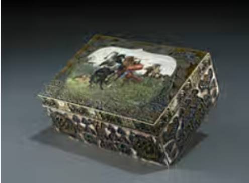 Silberdose mit Silberdrahtauflagen, diese emailiert in gedämpften Farben. Auf dem Deckel in einer Kartusche die Emailmalerei mit der Darstellung eines Kampfes von Tscherkessen. Im Inneren vergoldet. Gemarkt am Boden und am Deckel. Russischer Doppeladler, Fabergé-Marke sowie die 88er Marke. Mehrere Fehlstellen des Emails. Maße: 3,5 x 8 x 5,8 cm. Moskau, um 1890. (651861)