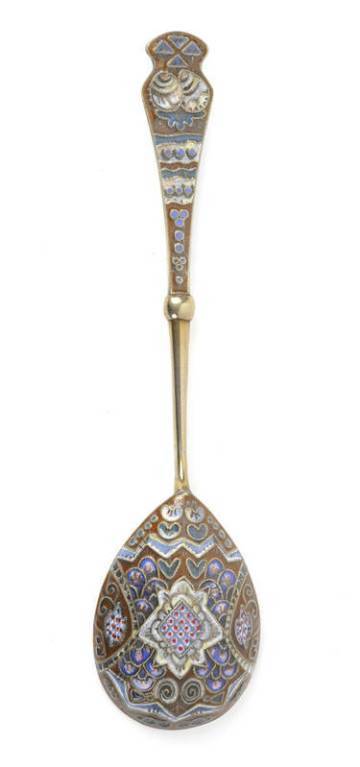 A Russian Silver and Enamel Spoon, bearing marks for Faberge, Moscow, circa 1908-17