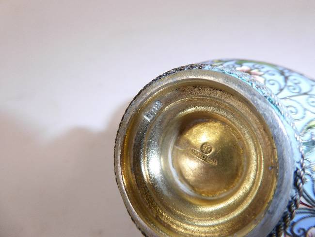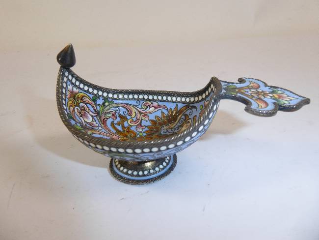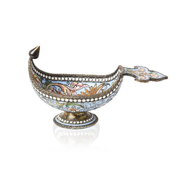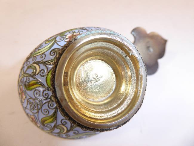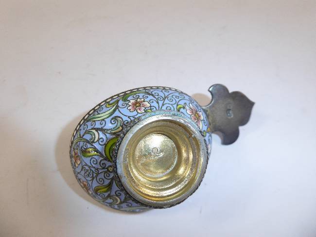 oval and on spreading conforming foot, with vari-coloured cloisonne enamel on a pale blue ground, the interior featuring a double-headed eagle within foliage and flowers, the outside and the handle with further foliage and flowers, with white enamel beaded borders, tapering finial and corded borders