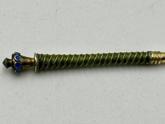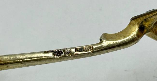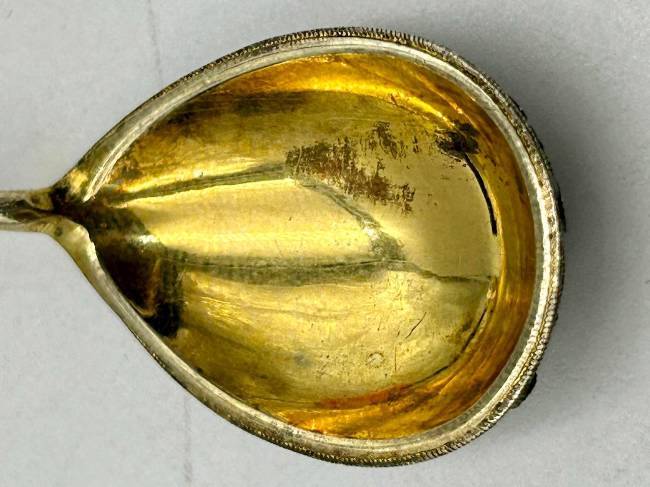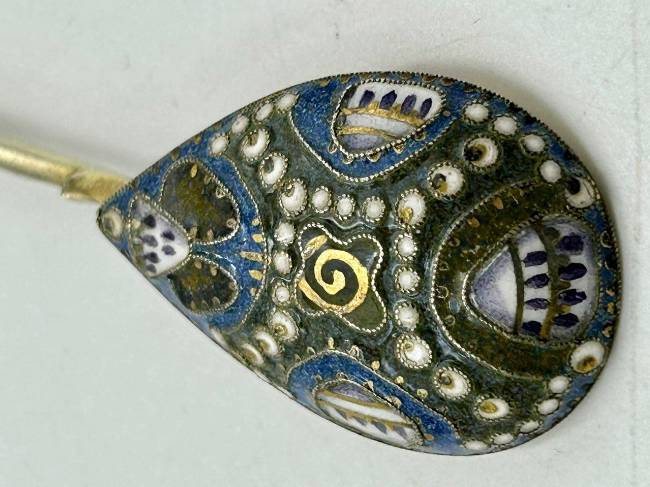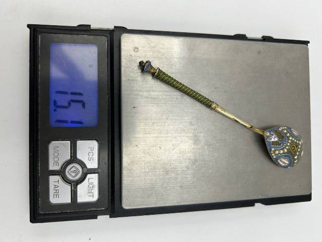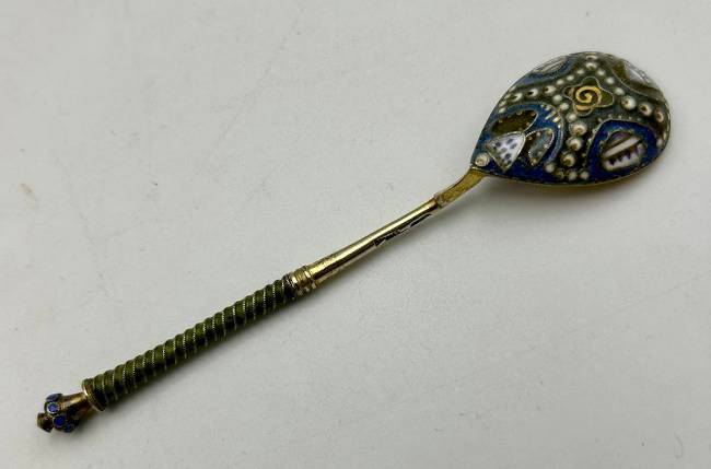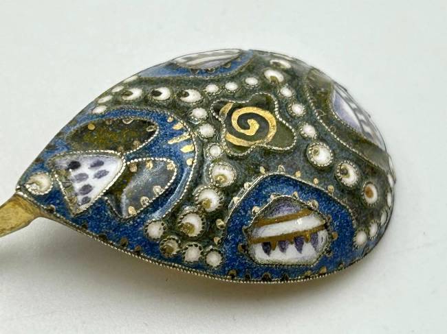 Ложка кофейная с витым стеблем с зеленой эмалью, завершающимся фигурным элементом с орнаментом сканных кружков с синей эмалью внутри. Внутренняя поверхность чашечки позолочена, внешняя декорирована абстрактным полихромным эмалевым узором в крапчатых сине-зеленых тонах по сканному орнаменту в сочетании с белыми кружочками и треугольниками белой эмали с черными точками и амальгамой.