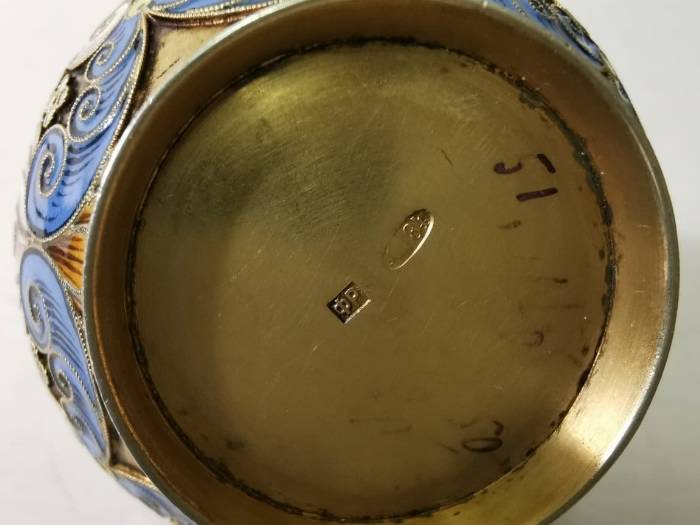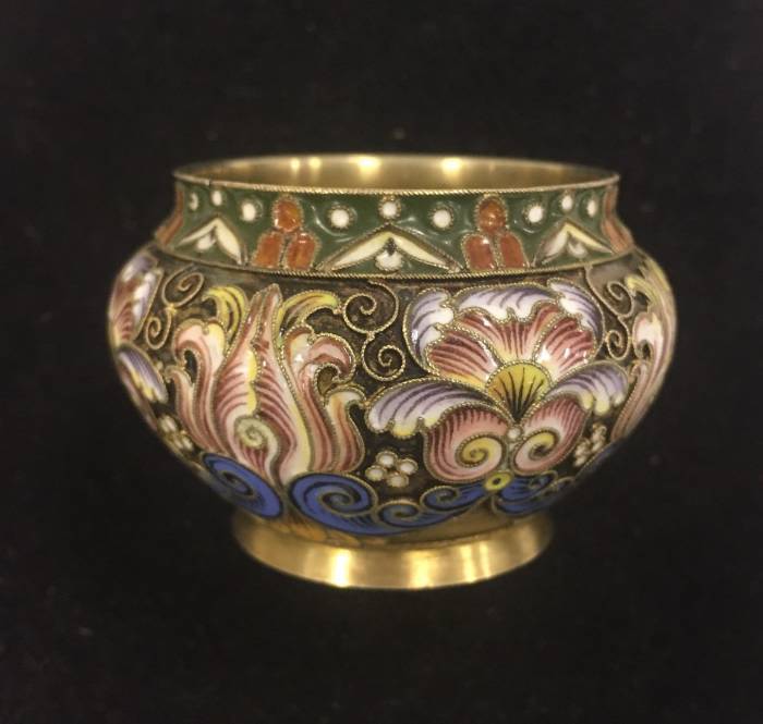Солонка, серебро 84 пр. Перегородчатая, росписная эмаль. Именник Ф.Р. (Федор Рюкерт). Россия, конец 19 нач 20. Диаметр 5,5 см. Вес 51,10