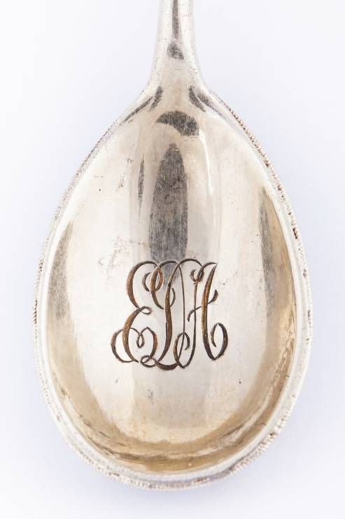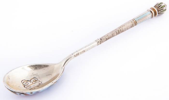 Клейма: 84 проба, клеймо «ФР», «женская голова в кокошнике, обращенная влево». Украшена вензелем.