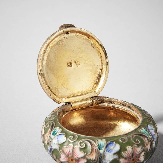 Fine Art & Antiques Autumn 2022 6 December 2022 305. 2296114. FEODOR RÜCKERT. A Feodor Rückert silver-gilt and cloisonnée enamel pill-box, Moscow 1896-1908.