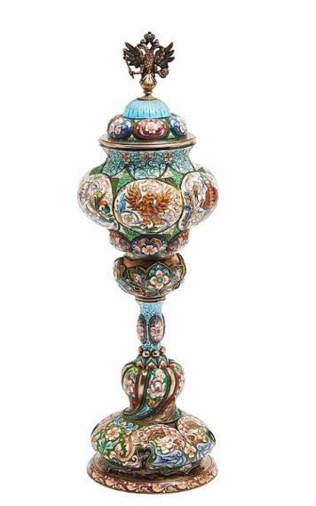 This Feodor Rückert (Russian,1840-1917) shaded cloisonne enamel presentation cup, Russian, 16 inches tall, brought the sale’s highest price of $207,900 ($30/50,000).