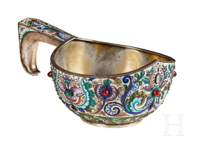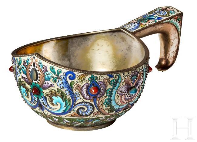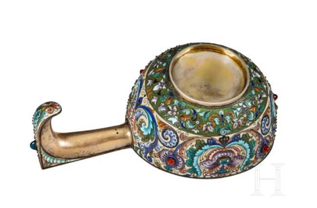 Gilt silver. The bulbous body embellished all over with leafy vines and stylised floral motifs in very finely shaded cloisonné enamel on a mostly cream-coloured, partly green background. Seven decorative cabochons arranged around the edge. The underside and handle stamped with the mark of district inspection administration, fineness "88" plus master's mark "F.R." in Cyrillic. Length 24 cm, total weight 601g. Although Feodor Rückert worked independently in his own workshop, most of his production was distributed by Fabergé.