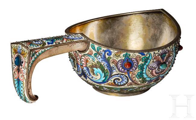 A large Russian silver-gilt and cloisonné-enamel kovsh, Moscow, Feodor Rückert, 1896-1908