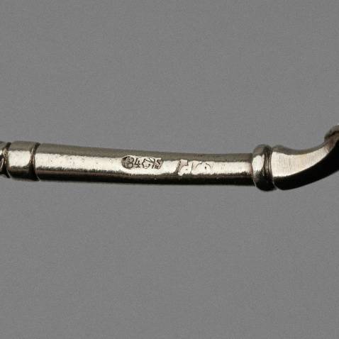 Клейма: 84 пробы с женской головой в кокошнике, обращенной влево и инициалами Московского пробирного инспектора И. Лебедкина,«Ф.Р.» — мастерской Федора Рюкерта.