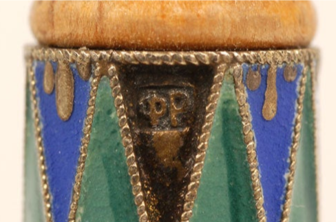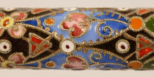 A Russian turned and carved birchwood serving spoon with a silver gilt and cloisonne enamel handle, Feodor Ruckert, Moscow, circa 1900. The handle worked in a multi-color geometric mosaic pattern. Length: 7 5/8".