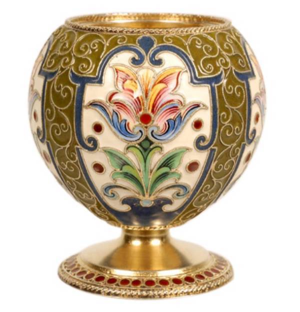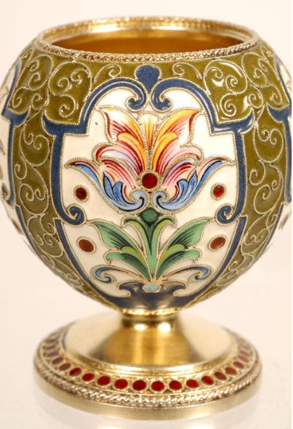 A Russian silver gilt and cloisonne enamel vodka cup, Feodor Ruckert, Moscow, 1896-1908. The bulbous body worked in multi-color stylized foliate cartouches on a cream ground surrounded by olive green enamel set with scrolling filigree wires . The raised circular base banded with a circle of red enamel beads. Dimensions: 2 1/4" H x 1 7/8" W.