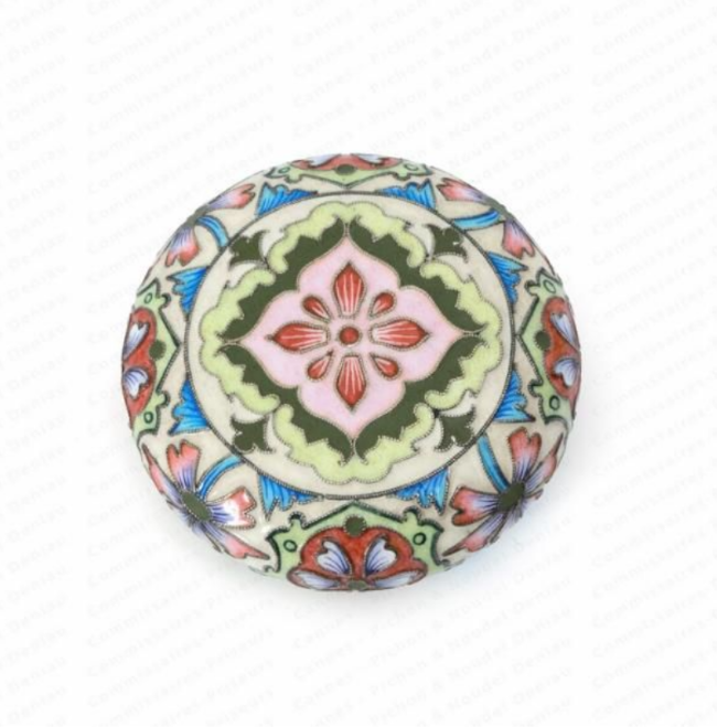De forme ronde, à décor d'un motif floral sur fond crème, entièrement en émaux polychromes cloisonnés. Le couvercle à charnières orné d'une plaque émaillée d'un bouquet de fleurs, intérieur vermeil. Bon état.